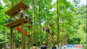 兴文石海景区近年来致力于从传统观光模式向“全天候、深体验”文旅生态转型。除了《仙宴洞天—逍遥宴》,景区还推出了两大沉浸式项目:全国首个以喀斯特地貌为载体的《石海长歌》夜游光影秀和采用“实景解谜+AR互动”模式的《僰影寻踪》秘境剧本游。景区还开发了多元户外项目,包括丛林穿越、溜索等,满足不同游客群体的需求。
