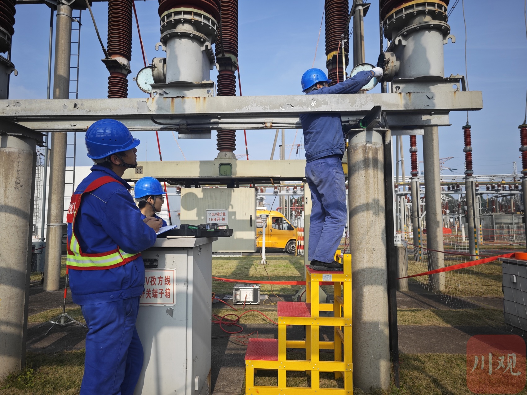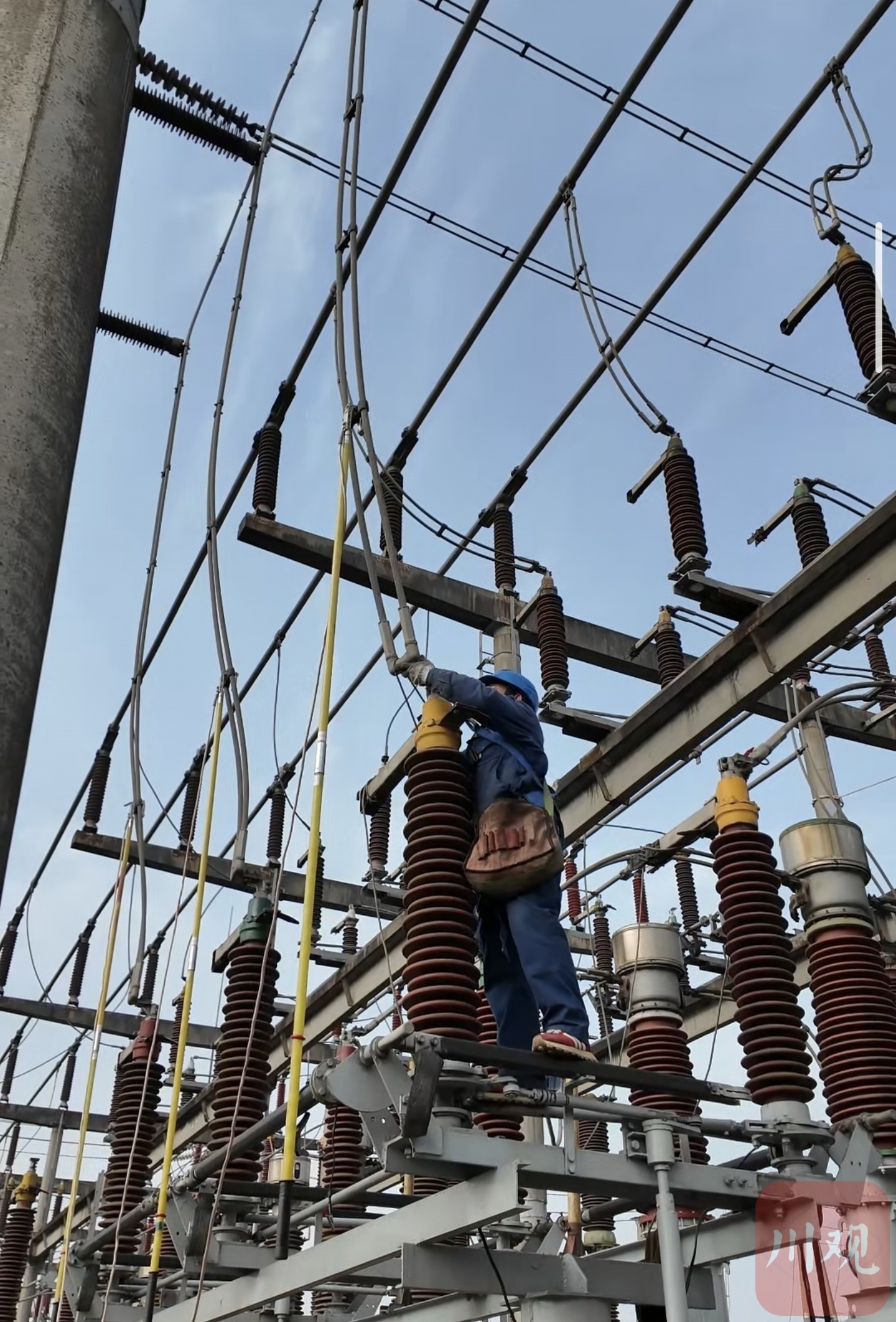 12月11日,宜宾市翠屏区宗场镇,220千伏孜岩变电站内一片忙碌。塔架上,4名“高空勇士”两两一组,精准地开展设备安装;地面,6名作业人员紧张地传递工具、输送材料做配合。针对这个变电站、为期半个月的综合检修,正进入关键阶段。