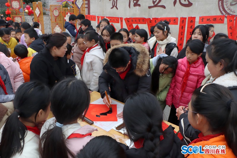 活动中还开展了拉歌、芦笙舞、竹竿舞、写春联等多种传统文化活动。该校五年级四班学生王玉汐说:“今天我和老师一起准备九大碗、写春联、打气球,还跟着大家跳芦笙舞,一整天都特别开心。”该校来自成都市大邑县的胡小路老师表示:“这是我第一次在学校吃九大碗,里面都是家乡农村常吃的菜,全是熟悉的年味,让我在学校也感受到了家的温暖。”