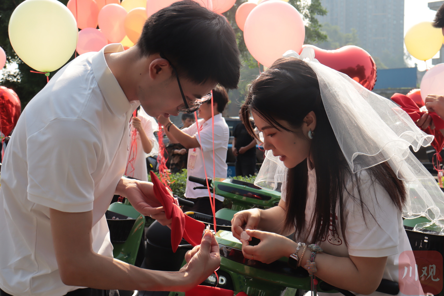 从培风广场出发,新人们沿着长宁河一路向东骑行,途径主办方设置的多个打卡点:在安宁金桥上的浪漫旋律站对唱情歌,在鲤鱼湾大桥旁的玫瑰花墙互赠鲜花,在淯江书吧获赠有关婚姻家庭的书籍……