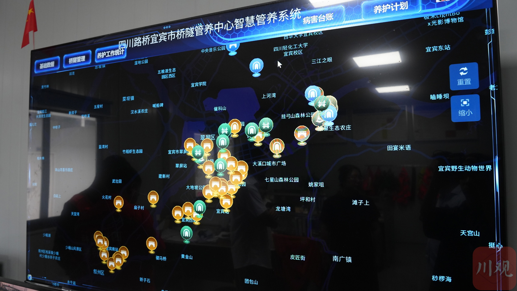 数据传回去后如何处理?在距离大桥几百米的宜宾桥隧管养中心监控室,大屏正实时刷新着桥隧基础数据、养护计划和巡查动态等信息。屏幕上,宜宾桥隧分布地图清晰展开,黄色图标代表普通桥梁,蓝色代表隧道,绿色带星标的是重点桥梁、弯曲线条则对应人行下穿通道,每一个图标都对应着具体的设施信息,42座桥隧的实时状态一目了然。