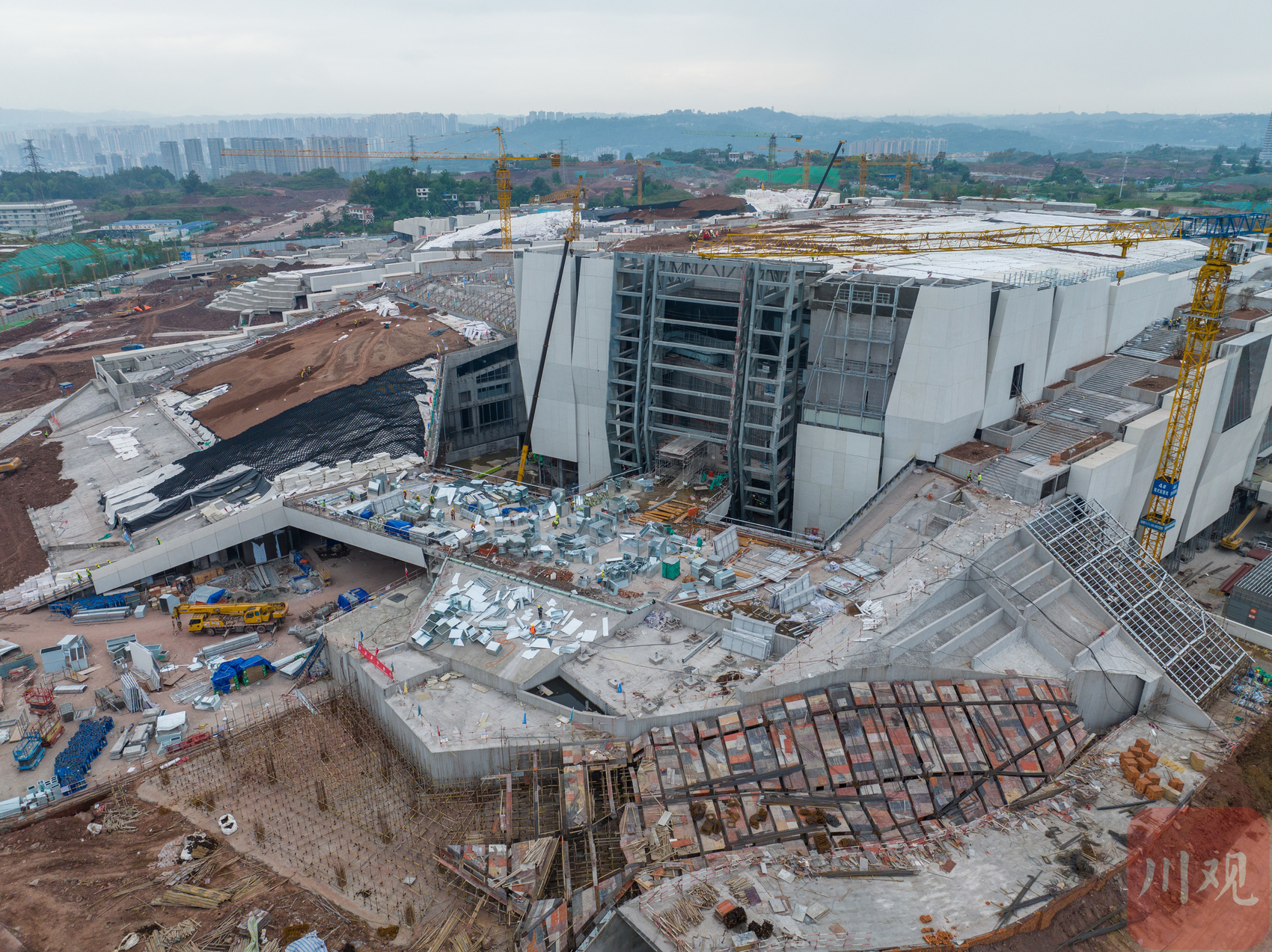 4公里外,另一种热闹正在上演。在宜宾市体育文化综合体项目工地上,2000余名工人、近400台设备正在为同一个目标忙碌:在省运会到来前,把这座“庞然大物”完整地交给宜宾。