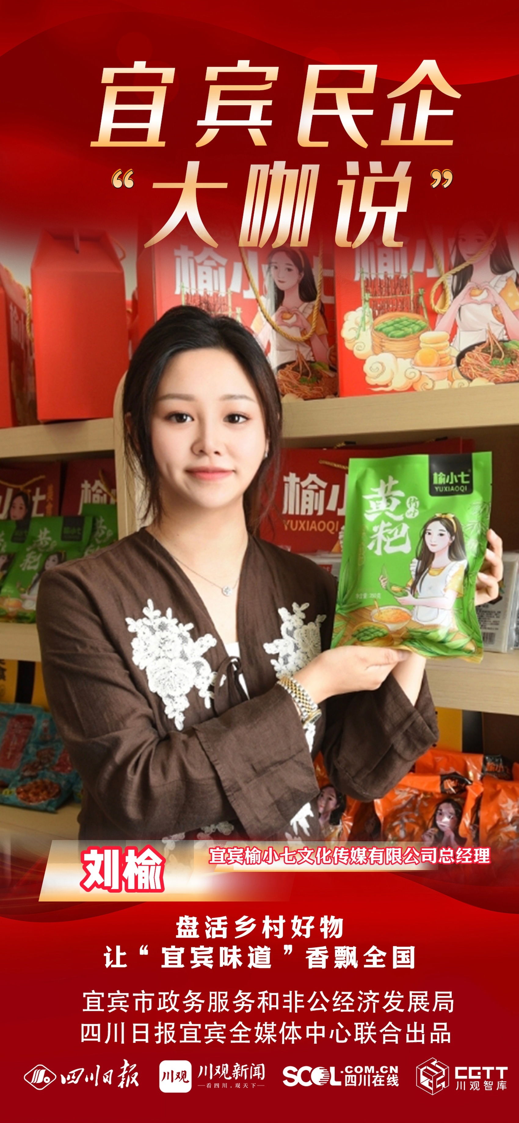 成立于2019年的榆小七,是一家年轻的综合性传媒公司。2023年,公司通过电商直播,助力宜宾地方农副产品销售总产值突破1.2亿元,其中萝卜干、苕皮销量位居全国第一。2024年,榆小七销量突破100万单,带动50余户农民增收致富。