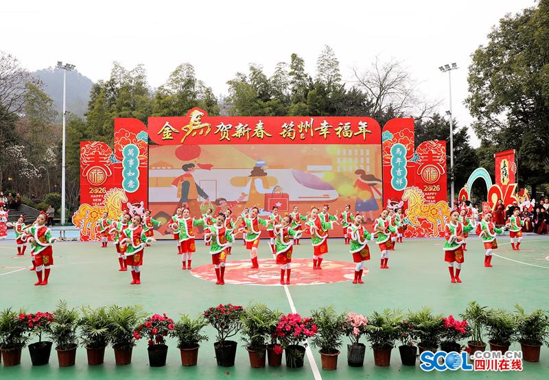 在筠连其他地方,新春大拜年活动与社区文艺迎新春活动轮番上演,“筠州大舞台”让普通百姓成为舞台主角,在高坪苗族乡、蒿坝镇、团林苗族乡等地同步举办苗族花山节,传统活动让游客沉浸式体验苗家文化,游客还能在农特产品展销区选购地道的筠连好物。
