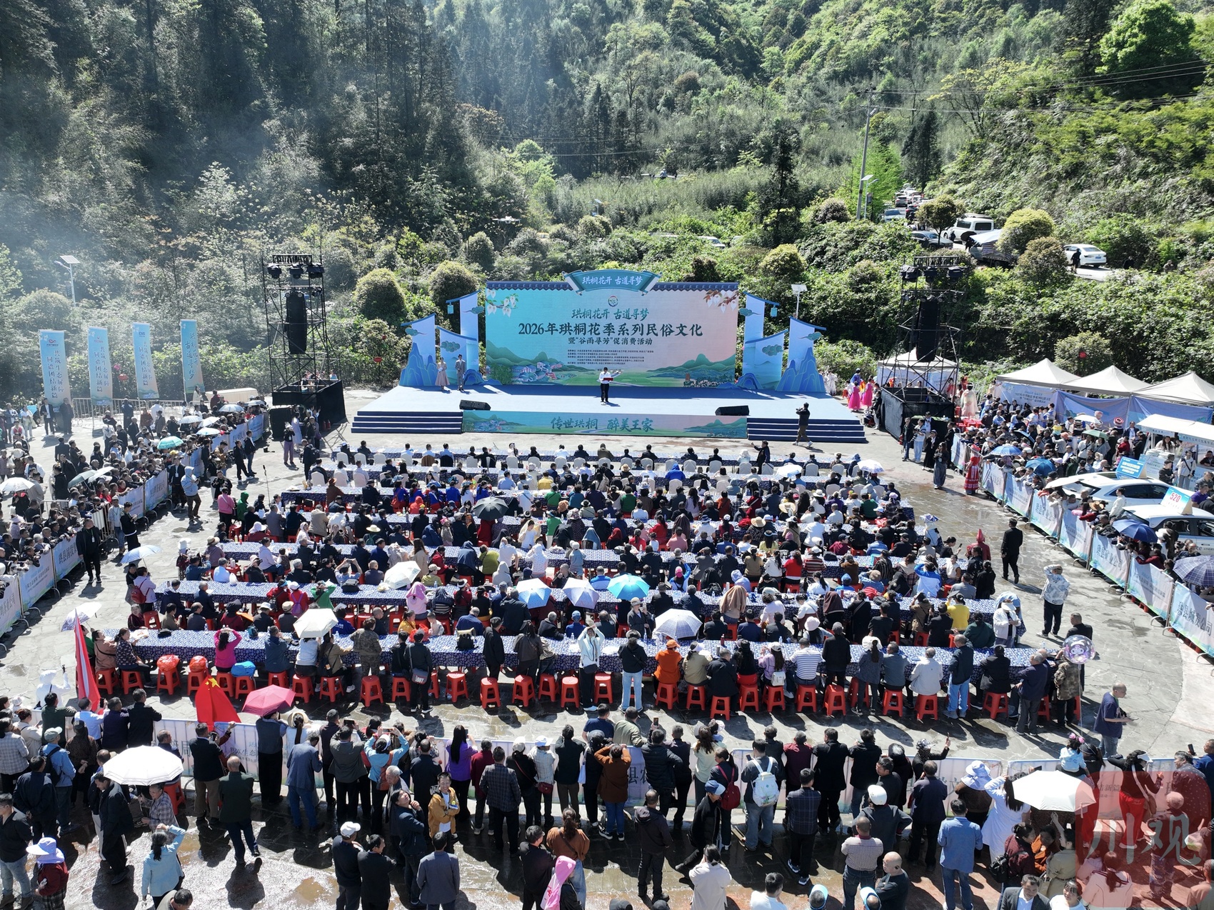 当天,来自珙县和云南威信县的少数民族团队同台献艺,苗族鼓韵铿锵有力,彝族舞步热情奔放。节目间隙穿插互动问答,涵盖苗彝习俗、珙桐花知识、五尺道历史及生态环保等内容。午间,一场别开生面的“珙桐花下·同心长桌宴”开席。长长的餐桌旁,游客与当地群众围坐一起,品尝着菜豆花、老腊肉、罗汉笋等地道的川滇美食,共享川滇毗邻地区“一家亲”的融融暖意。